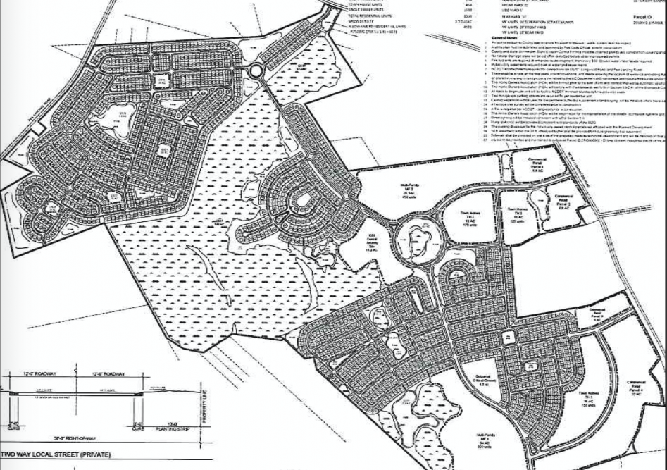 The most gargantuan subdivision is planned for a spot in western Brunswick along Highway 17, a few miles north of Sandpiper Bay Club. Timber Farms, as it’s called, would comprise thousands of lots on 800 acres of land. Specifically, the developer proposed 1,600 single family lots, 450 townhomes and 950 multifamily units.