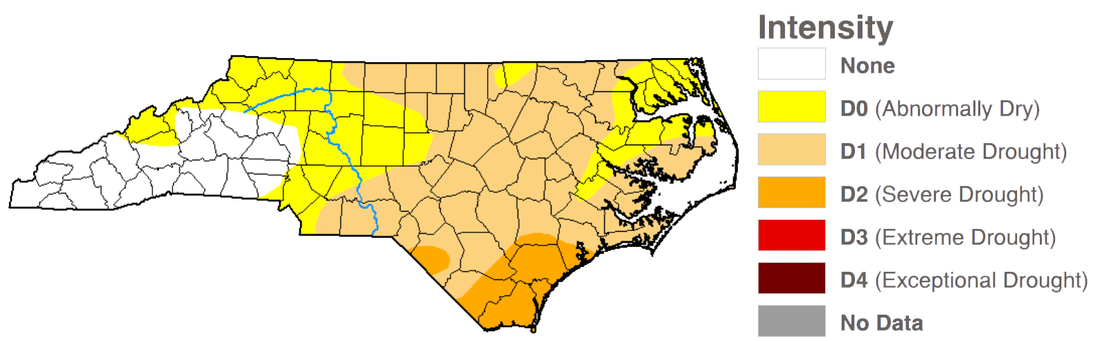 Dry conditions also triggered local water use notices, with local providers asking customers to curtail nonessential use to mitigate increasing demand, exacerbated by the ongoing drought. Drought categories are determined by streamflow, groundwater levels, water available in reservoirs, soil moisture, season, and other factors, according to the North Carolina Drought Management Advisory Council.