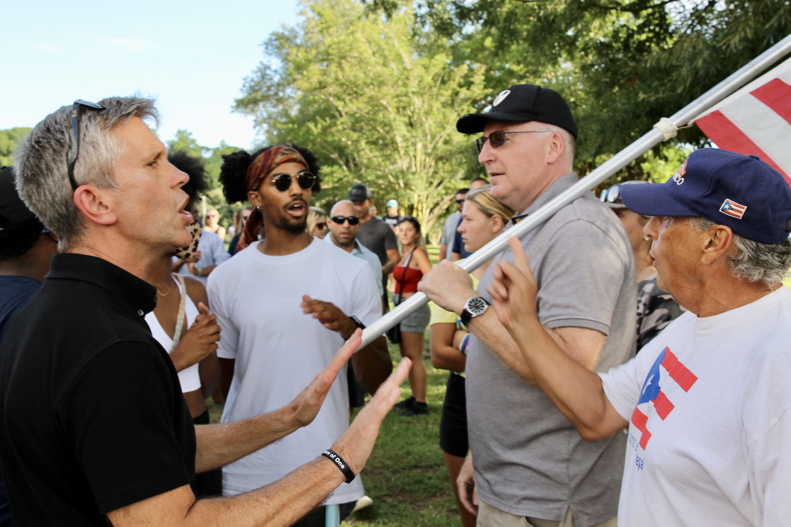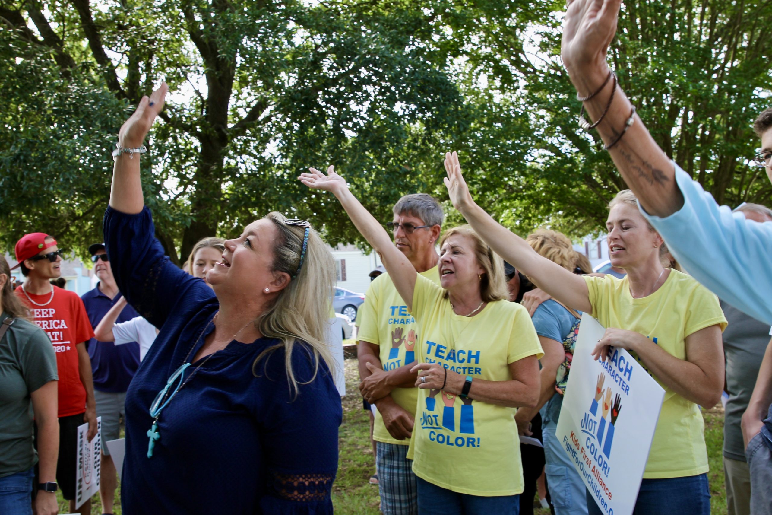 At times the other group sang the “The Star-Spangled Banner,” recited the Pledge of Allegiance and yelled “Jesus” as they raised their hands in worship. Leaders spoke into a megaphone, decked out with an “InfoWars” sticker, about why they believe it’s wrong to teach children about racism.