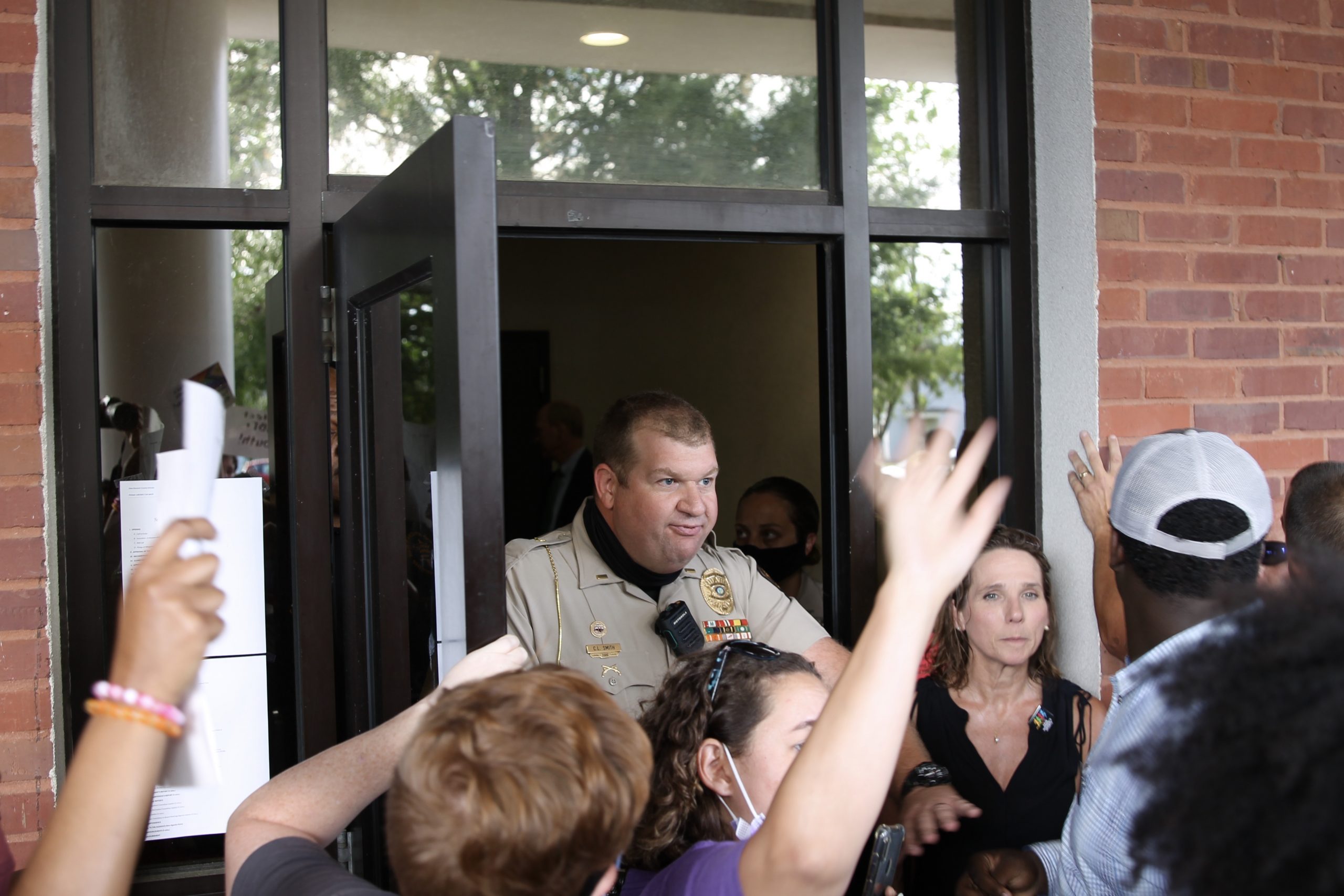 Outside the doors, the sheriff’s office and a NHCS staff member formed a line to allow the 56 speakers in, one at a time.