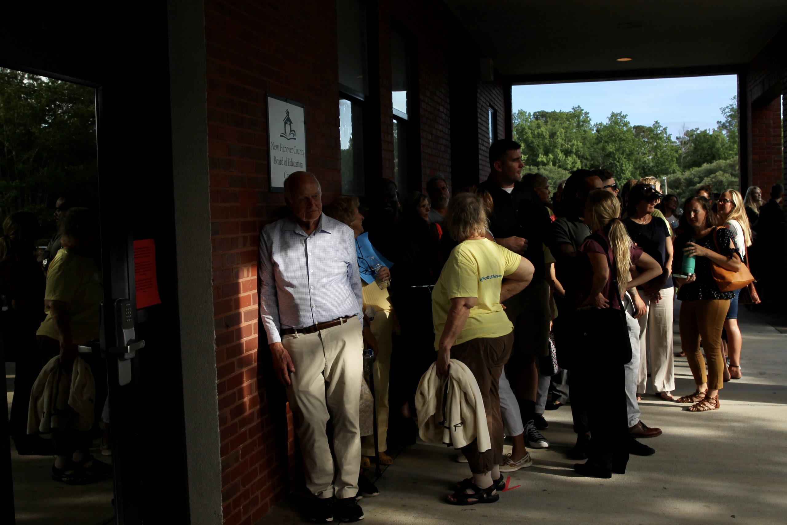 Wilmington police cars circled the scene and New Hanover County Sheriff’s deputies surveyed from the parking lot and peered through glass doors from inside the building. Three extra deputies, in addition to the two regulars who attend, were assigned to the meeting to mitigate the anticipated crowds.