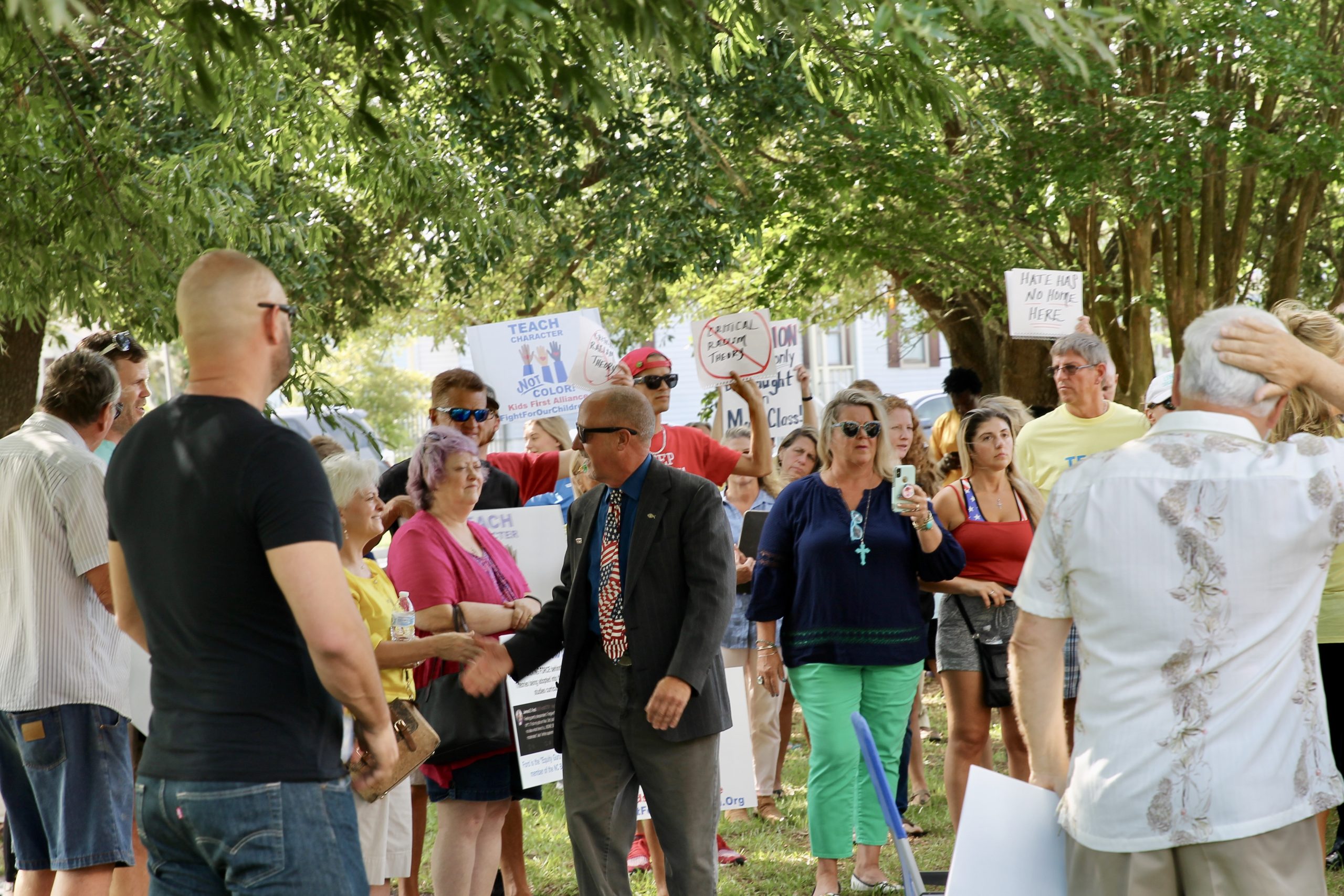 Around 5:30 p.m., protesters elbowed toward the front of the building as a sheriff’s deputy ordered the group to back up. By the time the meeting started, the room filled, although it was unclear who had been brought in. The members of opposing political groups –– including the New Hanover County GOP, the lowercase leaders and education activists –– were locked outside, sometimes debating peacefully and other times ridiculing, cursing and throwing middle fingers in each other’s directions.