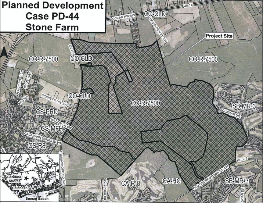 Tracts of this size are a rarity among development applications in Brunswick County, and are virtually extinct in New Hanover County. Stone Farm is a mammoth project located south of Highway 17. Beyond the 1,000 acres included in the Brunswick County application, an additional 128 acres of this developer’s land are located within the Town of Calabash, meaning that portion will be subject to a separate regulatory channels.