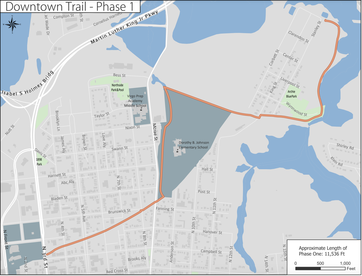 As planned, the path would begin on 3rd Street and follow along the CSX rail line, wrap around Dorothy B. Johnson Elementary School and follow along to Archie Blue Community Park where it will run parallel to the creek before ending at the Love Grove Bridge.
