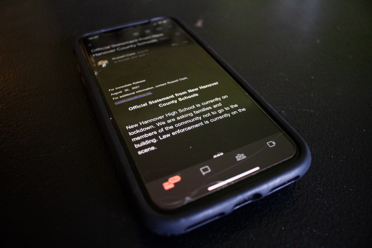 Roughly 30 minutes later, the district pushed out its first call and email at 11:52 and 11:53 a.m. with the same message: “New Hannover [sic] High School is currently on lockdown. We are asking families to NOT come to the building. Law enforcement is currently on the scene. We will update our New Hanover Highschool [sic] Families as more information becomes available.”