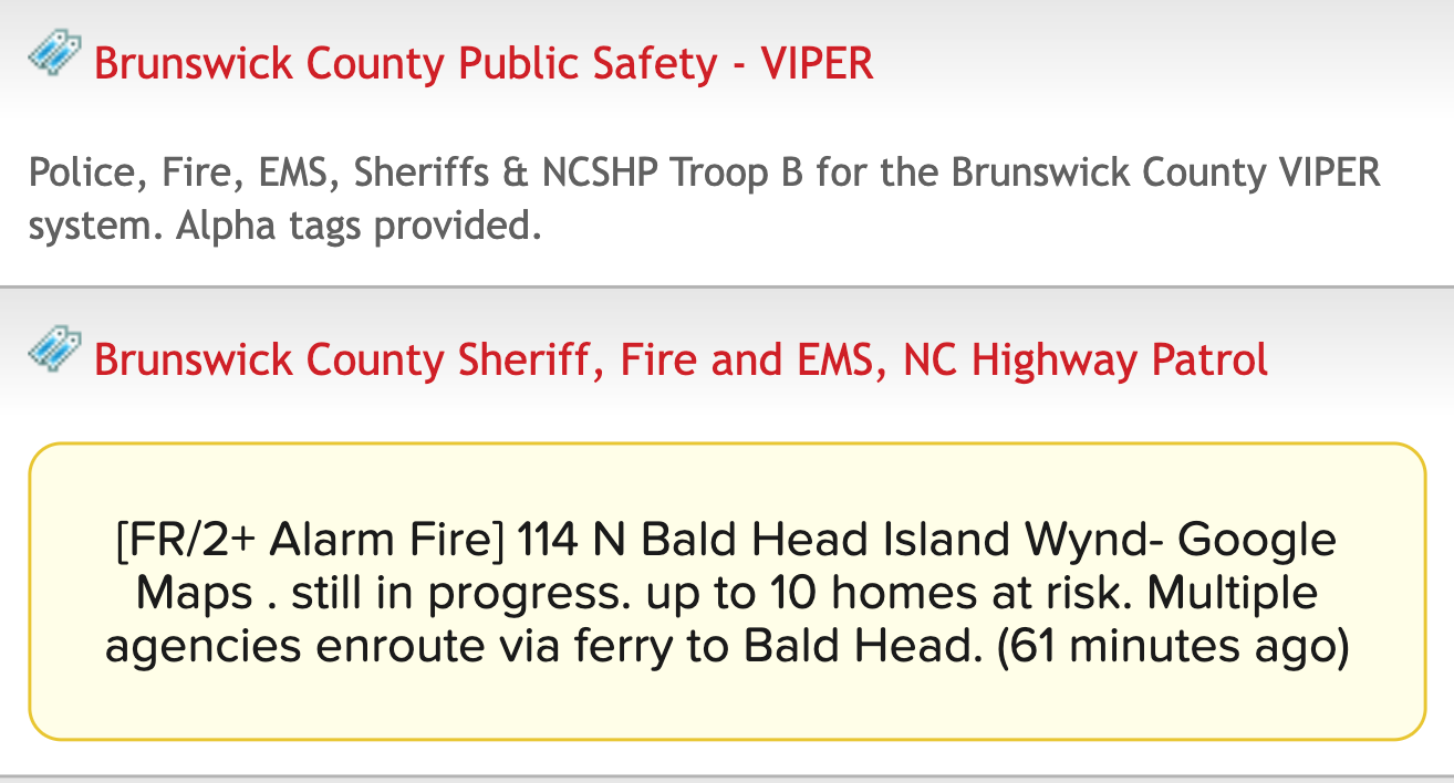 Around 9:30 p.m., public safety alerts — streamed in real time here — note up to 10 homes are at risk near the 114 N. Bald Head Island Wynd address.