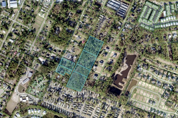 The property is bound by an existing manufactured-home community, Lee AcresMobile Home Park apartments, to the east and west and single-family homes to the north and south.