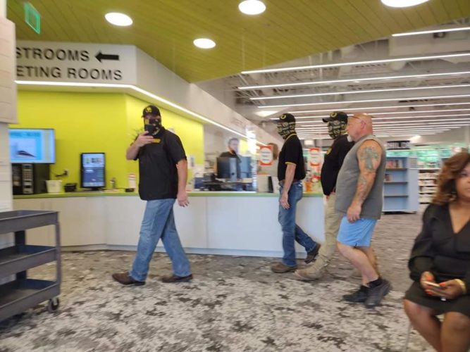 Twenty or 30 minutes into the event, the Proud Boys — around five or so — and other protesters moved from the perimeter outside of the building and into the library. According to Kahney, it looked like the deputies were escorting them into the room.
