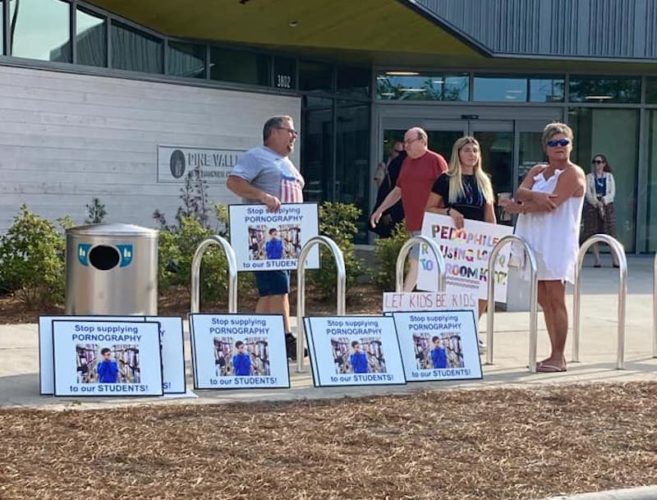 Roughly 20 protestors, some identifying as Christians and a handful decked out in Proud Boys gear, were holding signs: “Stop supplying pornography to our students” and “Pedophiles are using LGBTQ to groom kids.”