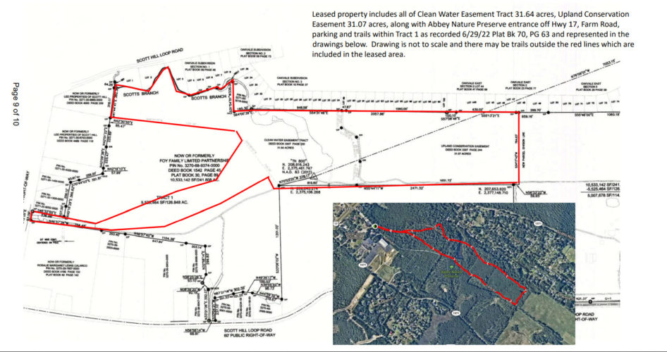 “The leased property includes all of Clean Water Easement Tract 31.64 acres, Upland Conservation Easement 31.07 acres, along with Abbey Nature Preserve entrance off Hwy 17, Farm Road, parking and trails within Tract 1,” according to the document.