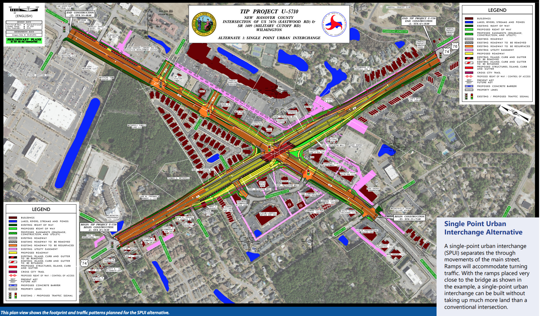 Phase two will handle the intersection itself, to become a single-point urban interchange. NCDOT will remove the signal at the Military Cutoff and Eastwood intersection and replace it with an Eastwood Road overpass crossing Military Cutoff. Ramps placed very close to the bridge will accommodate turning traffic. According to NCDOT, the interchange will not need much more land than a conventional intersection.