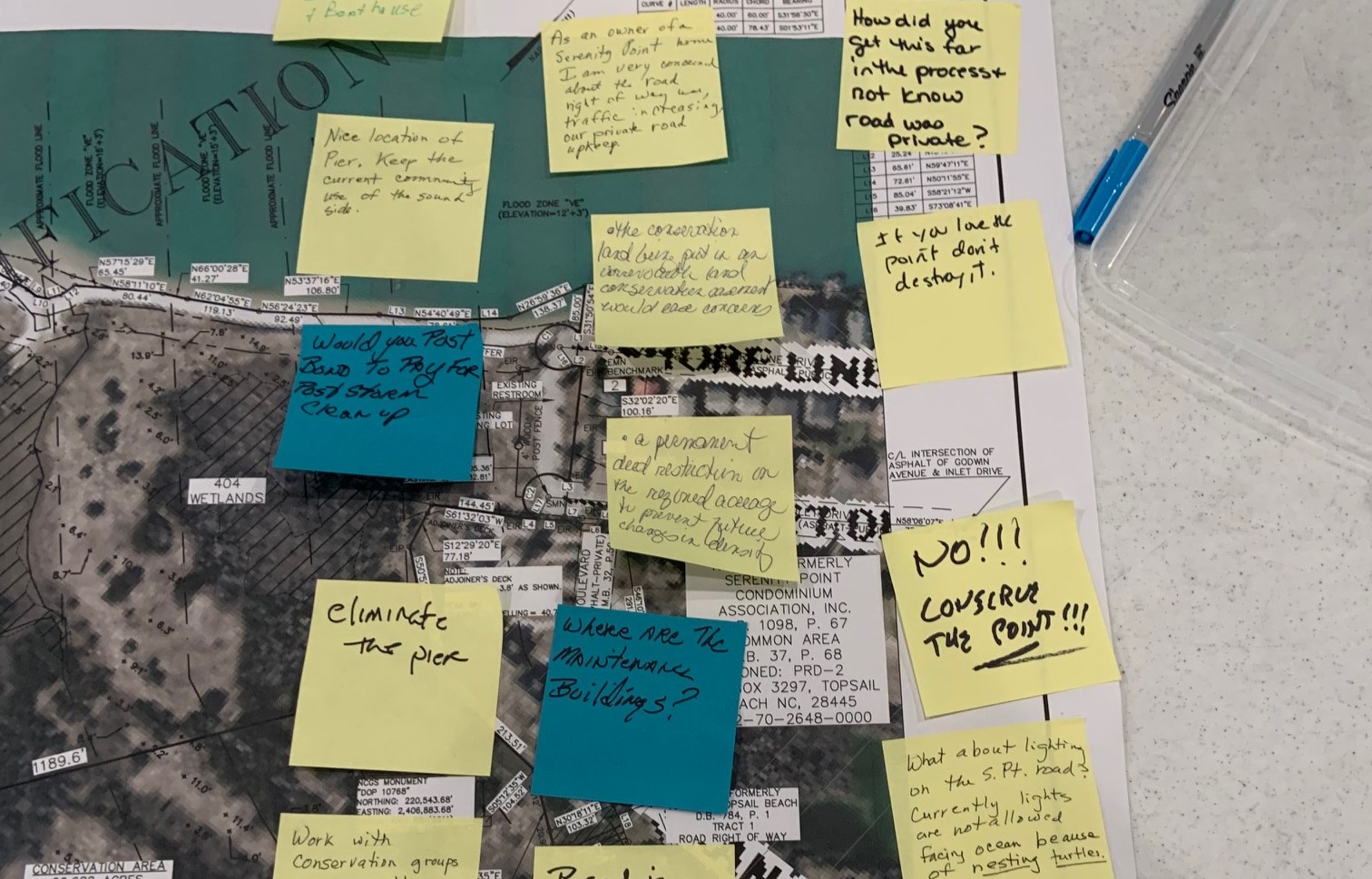 Roughly 50 Post-Its scribbled with feedback for a planned development ranged from “NO development!” to “I appreciate your intentions but residents need more info.” Two or three stated “100% support” and “Best solution for The Point. People don’t realize The Point can be developed.”