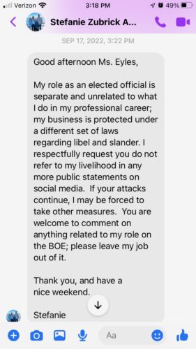 “You tout your business and professional background regularly from the dais,” Eyles wrote. “Maybe instead of trying to silence me and violate my right to free speech, you can take the time to respond to the concerns the community has as a board member.”