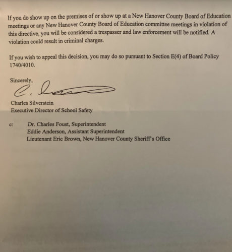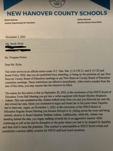 Eyles, who partners with local organizations such as NHC Educational Justice, Alliance Against Seclusion and Restraint and Lives in the Balance, has been an outspoken critic of the board during their public forums and on social media. Now, if she attends a school board meeting, she will be trespassing.