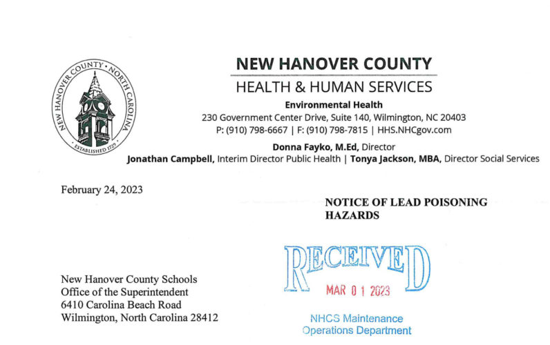 According to New Hanover County Schools, the state conducted an investigation into possible lead poisoning hazards on Jan. 24 after the district received an anonymous complaint. The testing revealed three of the 30 surveyed areas contained lead levels above what is allowed by state law, including dust on the interior auditorium stage floor, dust on the interior gym foyer floor and dust on the interior “mental health closet” floor.
