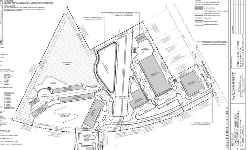 If the county approves the rezoning, Covington said he plans to phase tenants as building construction completes, with less than six at a time to start. The first phase will include the site’s infrastructure, including a stormwater pond and onsite septic area; utilities will be provided by Cape Fear Public Utility Authority. The front office building will also be constructed in phase one.
