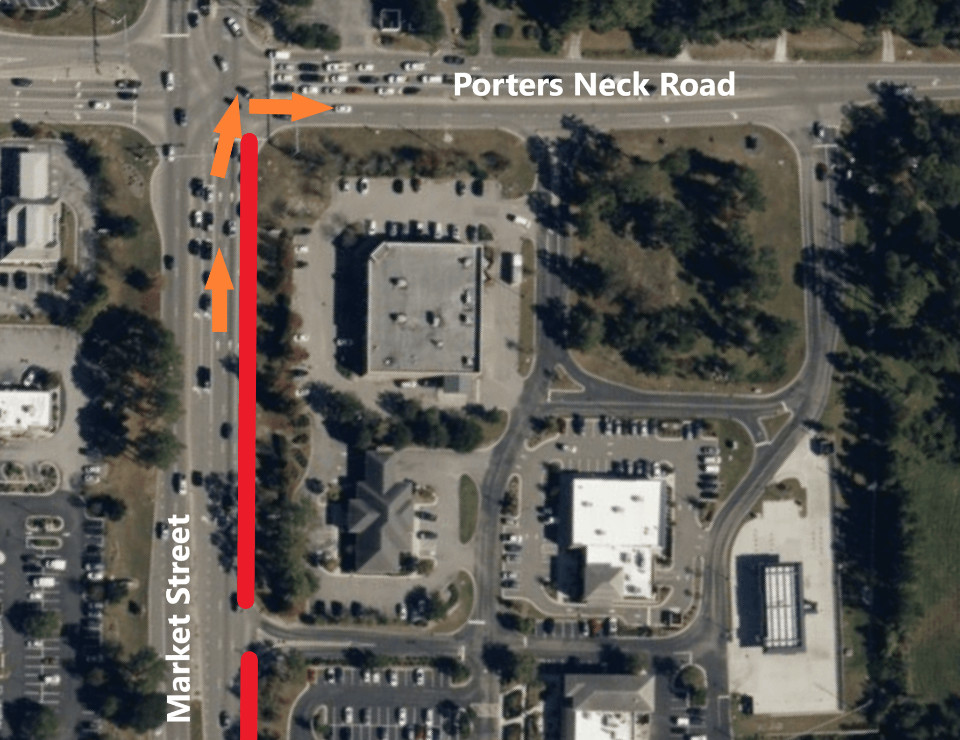 On July 10, the right turn lane from northbound Market Street onto Porters Neck Road will be closed to traffic. Right-turning traffic will still be allowed onto Porters Neck Road from the right-hand through-lane of Market Street. Access to the Oak Landing shopping center will remain open.