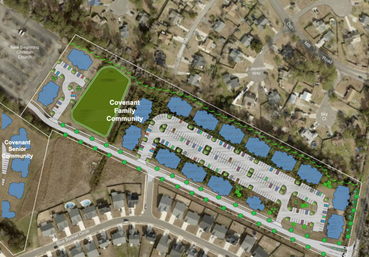 The site plan shows 16 buildings arranged in a circle near the border of the property, with parking located in the interior. Residents will be able to access the property from Blue Clay Road and from the church property on the other side of the development.