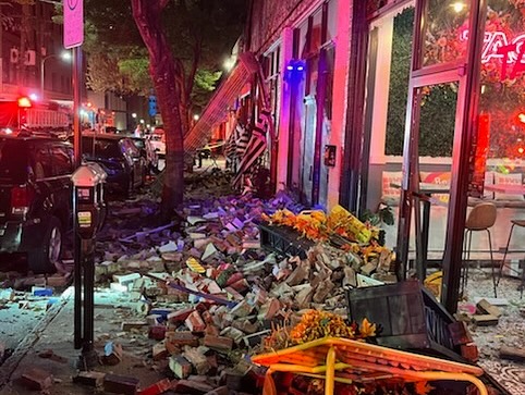 Now the pop-art rendering is dispersed along the sidewalk into piles of bricks, having shattered the restaurant’s windows. Rubble hit two vehicles in the vicinity and destroyed awnings that overhang above the businesses.