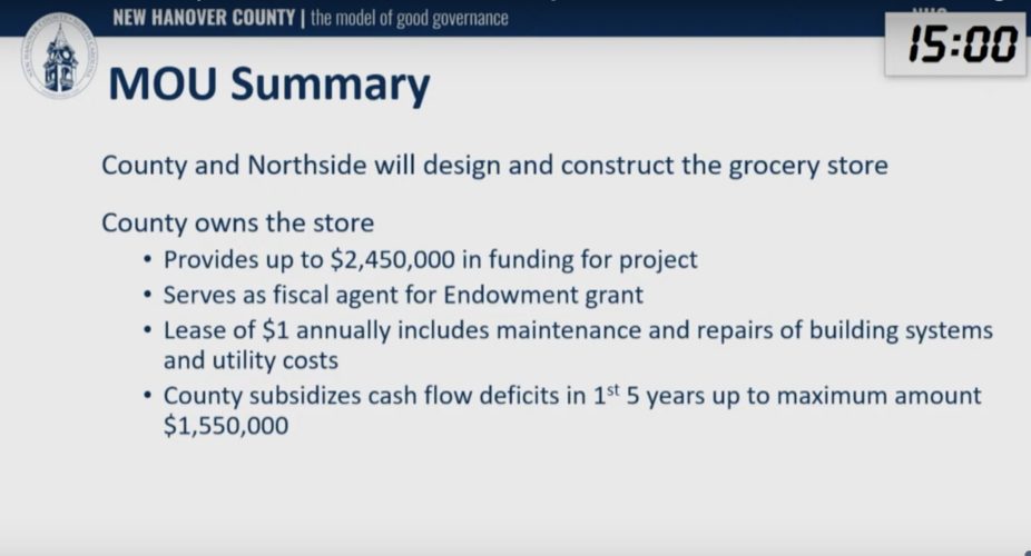 New Hanover County Commissioners were poised to sign off on an MOU with the Northside Food Co-op to solidify the responsibilities of each party. The county will invest millions to help build the grocery store, located in a food desert, and act as the fiscal agent of a multi-million-dollar endowment grant the co-op received last month.