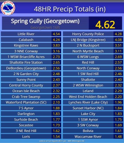The NWS has already reported rainfall up to 4 inches in towns closer to the South Carolina border, such as Calabash in Brunswick County. Shallotte, Sunny Point, Ocean Isle, Leland and Wilmington all have received more than 2 inches since weather conditions have worsened due to Debby.