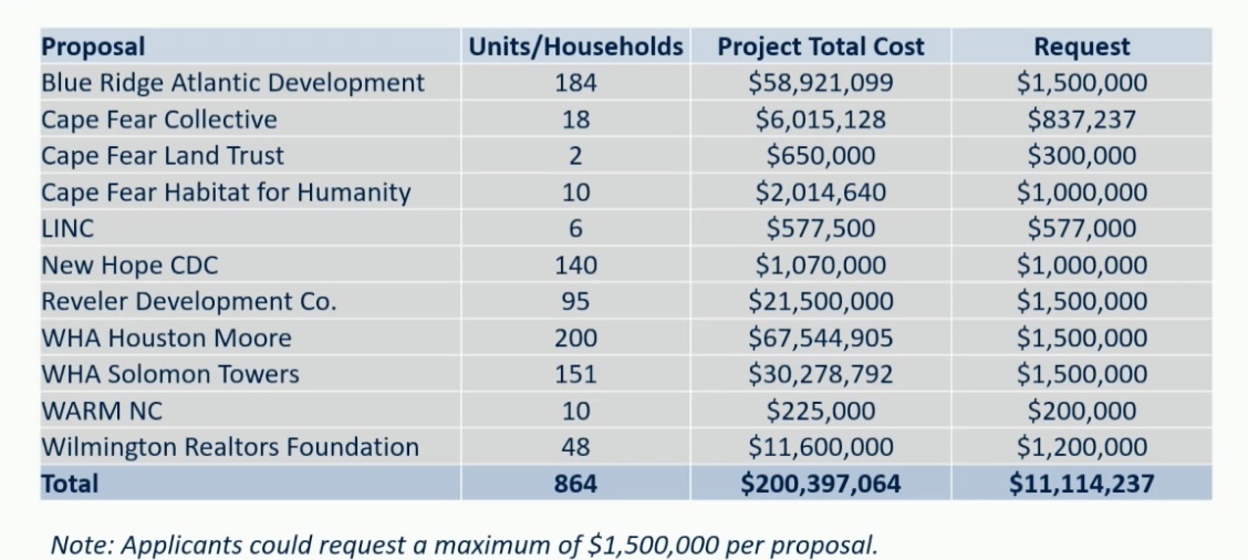 Cape Fear Habitat requested a million to build 10 housing units as part of Haven Place. It wasn’t fully funded but given $300,000 to fund six new homes, as construction is now underway for the $2-million project.