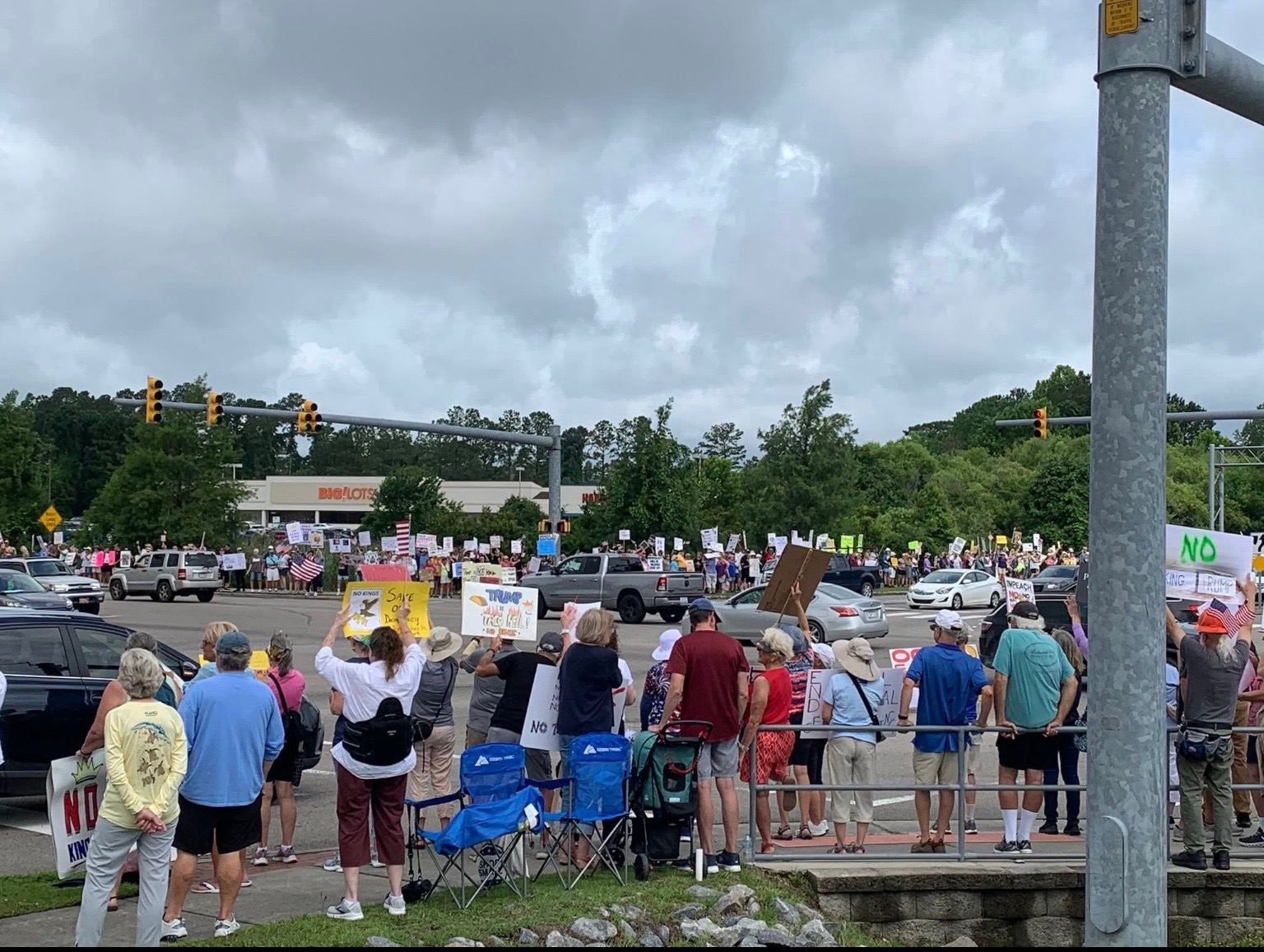Elsewhere in Brunswick County, a third protest was held in Leland along Olde Waterford Way and U.S. 17 in front of the Waterford Village shopping center. Over 500 individuals lined the grassy area near the roadway. The protest, organized by Indivisible Wilmington and Brunswick Indivisible Stepping Forward for Action, lasted from about 11 a.m. until roughly 1 p.m., when organizers advised participants to leave due to nearby lightning.