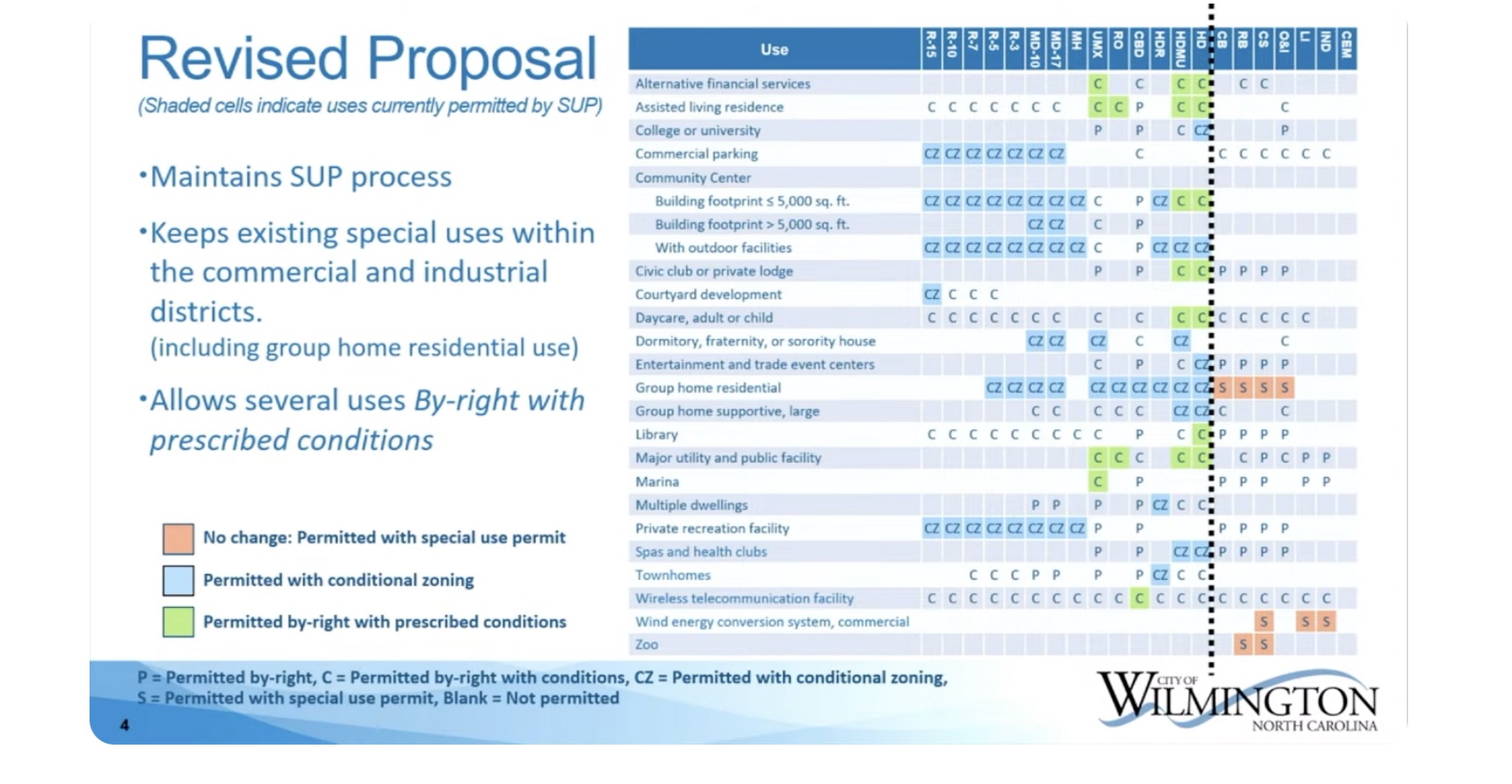 Changes also were made for some uses, like marinas in urban mixed use and libraries, to become permitted by-right with prescribed conditions. The conditions are the same as before under SUPs and were pre-written; they didn’t come from the ad-hoc committee meetings.