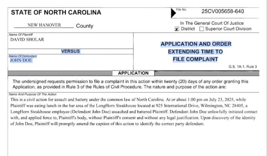 Sholar, 49 — who once owned Edward Teach Brewing — attempted to sue the victim, listed as “John Doe” on the civil action. Sholar claimed the employee “assaulted and battered” him at a LongHorn Steakhouse on July 23 around 1 p.m. Yet, Sholar faces a misdemeanor assault charge for inflicting serious injury; the plate shattered upon impact on the victim’s head, causing a hairline fracture and 3.5-inch laceration requiring seven stitches.