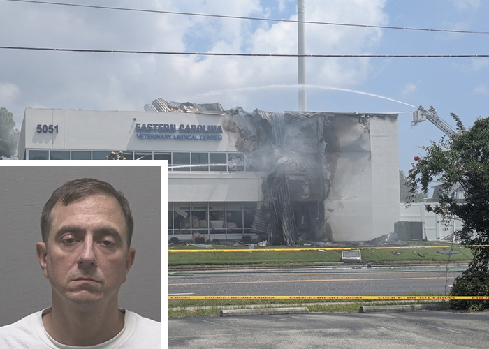 Beach was making a turn onto New Centre Drive from Bob King Drive when he hit a natural gas line and fled the scene. Firefighters responded to the gas leak and conducted a primary search to ensure Eastern Carolina Medical Veterinary Center was empty when the explosion occurred. The roof blew off the building and the vet clinic caught fire.