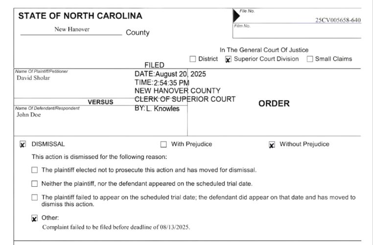 Sholar’s lawyer listed on the civil action was Christopher Dodd of Brooks Pierce, who asked the courts for an extension to file the official complaint and summons to be served. The courts allowed 20 days to update it, including naming the party of John Doe and filling in the address. However, the deadline of Aug. 13 was missed.