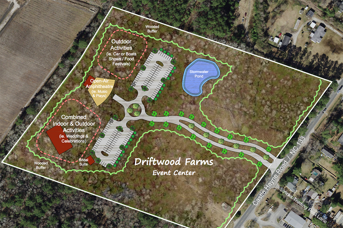 Driftwood Farms Event Center is the working title of the in-the-works project, which involves an open-air amphitheater and multiple event spaces, positioned on Castle Hayne Road.