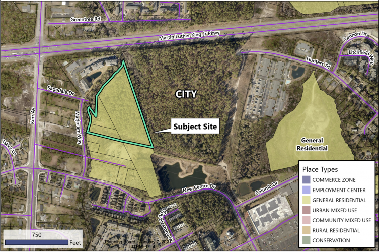 Directly east of the Raines parcel, there is a 40-acre tract that approaches Market Street, with Target to the south and MLK Parkway to the north. Attorneys representing those landowners submitted a last-minute brief to the planning board just hours before the meeting started. It said a road extension through the 40-acre tract — which is under city jurisdiction — was previously approved to ease Market Street traffic conditions and promote road connectivity.