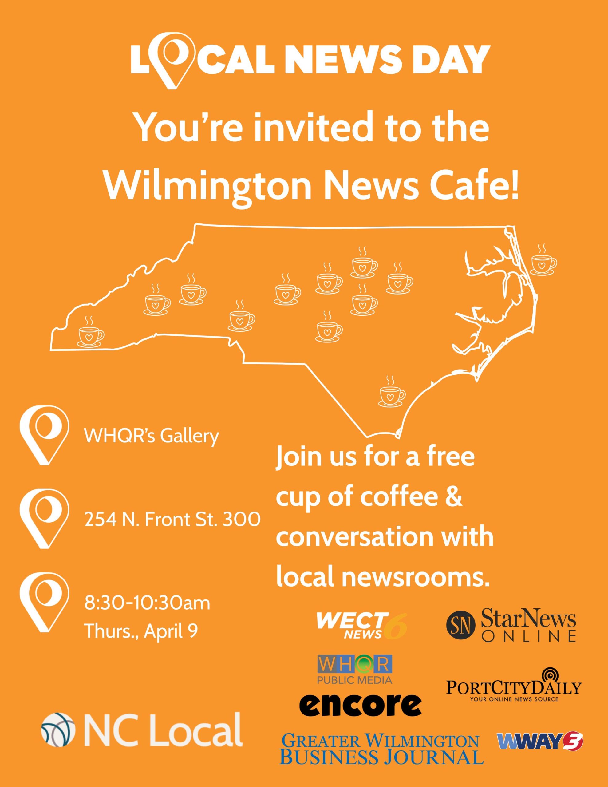 The Wilmington event will take place at WHQR Gallery on Thursday, April 9, from 8:30 a.m. to 10:30 a.m., and is free and open to the public. Participating will be NC Local, WHQR, Port City Daily, StarNews, WECT, Greater Wilmington Business Journal, WWAY and encore.