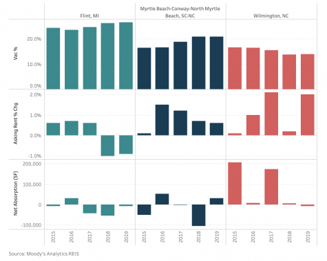 Nearly 80 miles south of Wilmington, Myrtle Beach — with a 31% share of service sector employment — had the second-highest retail sector vacancy rate in 2019, approaching 21%. Wilmington, on the other hand, had a healthier rate of 13.9% in 2019, which was still 3.7% higher than the national average.
