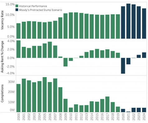 It also showed national rent growth rebounding slightly from 2011 to 2015, plateauing, then slowing to 1.2% growth in 2019. (Wilmington’s rent growth jumped from .2% in 2018 to 2% the following year.) Moody’s ‘Protracted Slump Scenario’ forecasts a 3.7% decline in 2020 due to the pandemic, before making its way back to 1.3% by 2024.