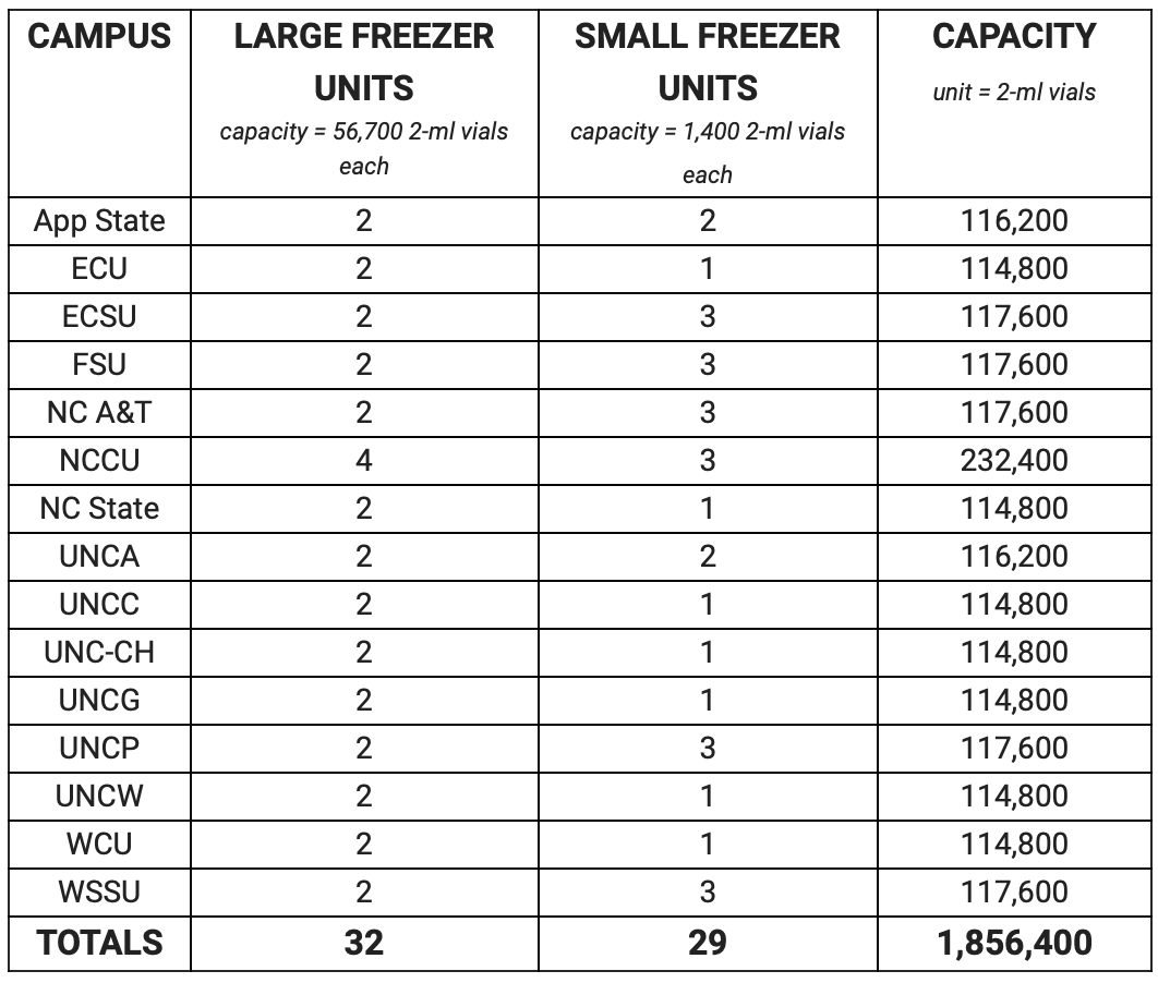WILMINGTON—Funds from a University of North Carolina initiative will enable the stockpiling of 61 new freezers, designed to store Covid-19 vaccines at temperatures as low as -112 degrees Fahrenheit, at 15 universities around the state.