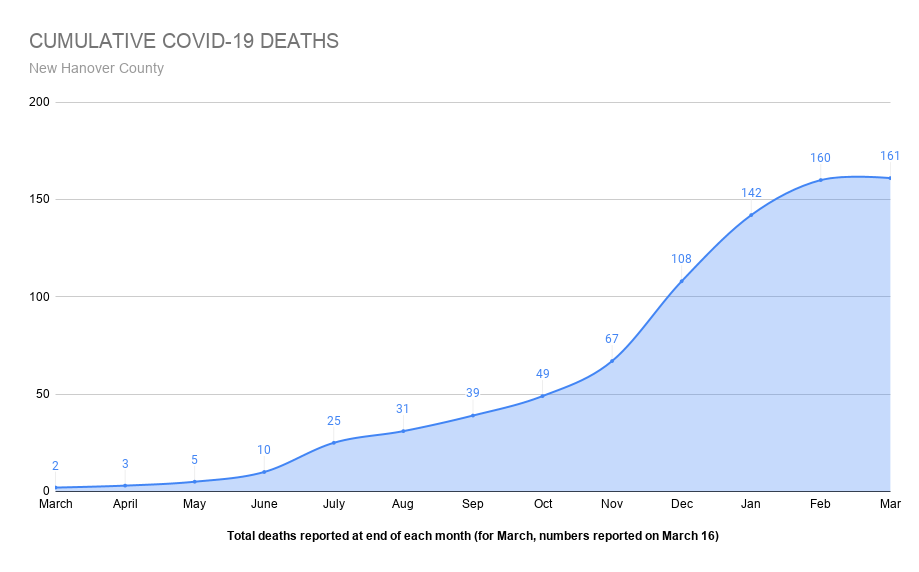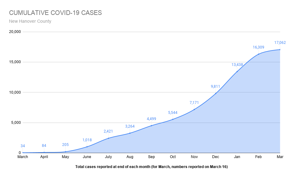 The next day, March 18, New Hanover County announced its first presumptive positive Covid-19 case; there were 63 positive cases in the entire state. One year later, the county has recorded 17,062 cases and 161 deaths, while the statewide numbers near 900,000 cases and 12,000 deaths.