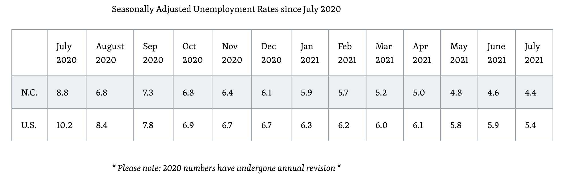 The state’s seasonally adjusted unemployment rate has fallen to 4.4% in July 2021 — below the 5.4% national average. The state’s statistic decreased by half from 8.8% a year ago.