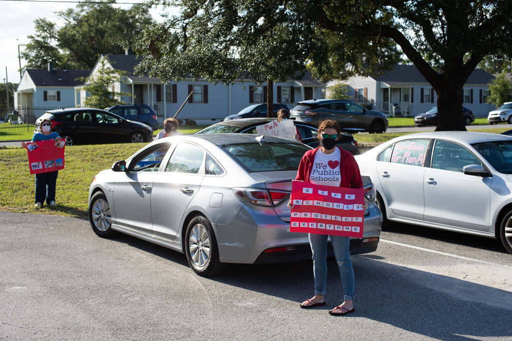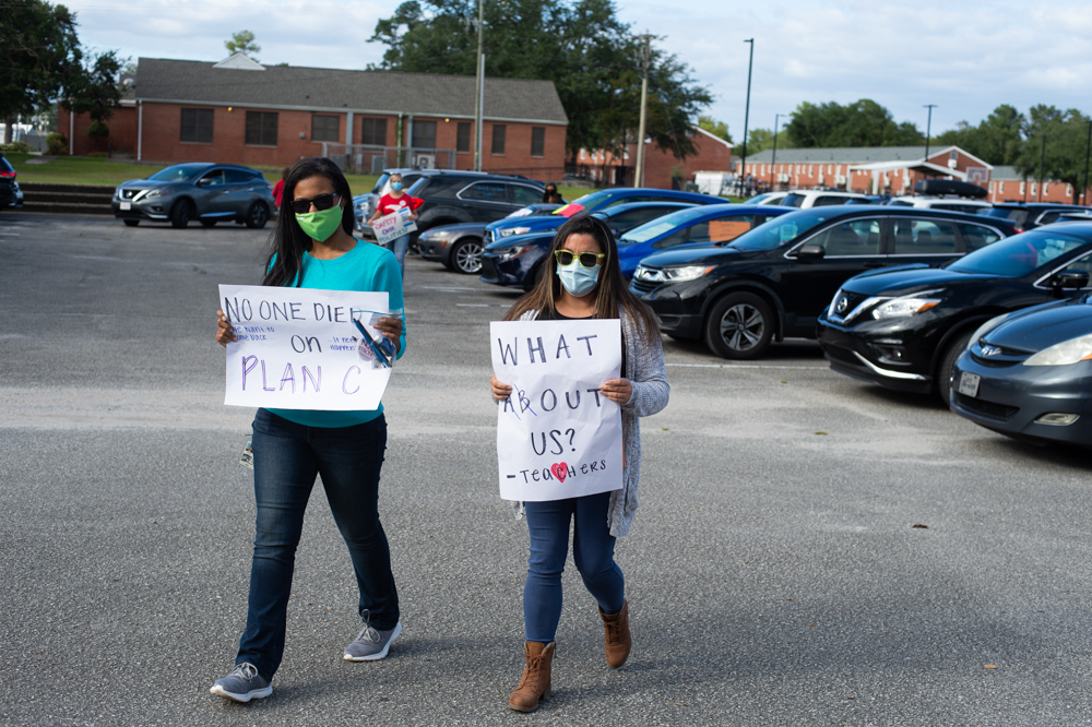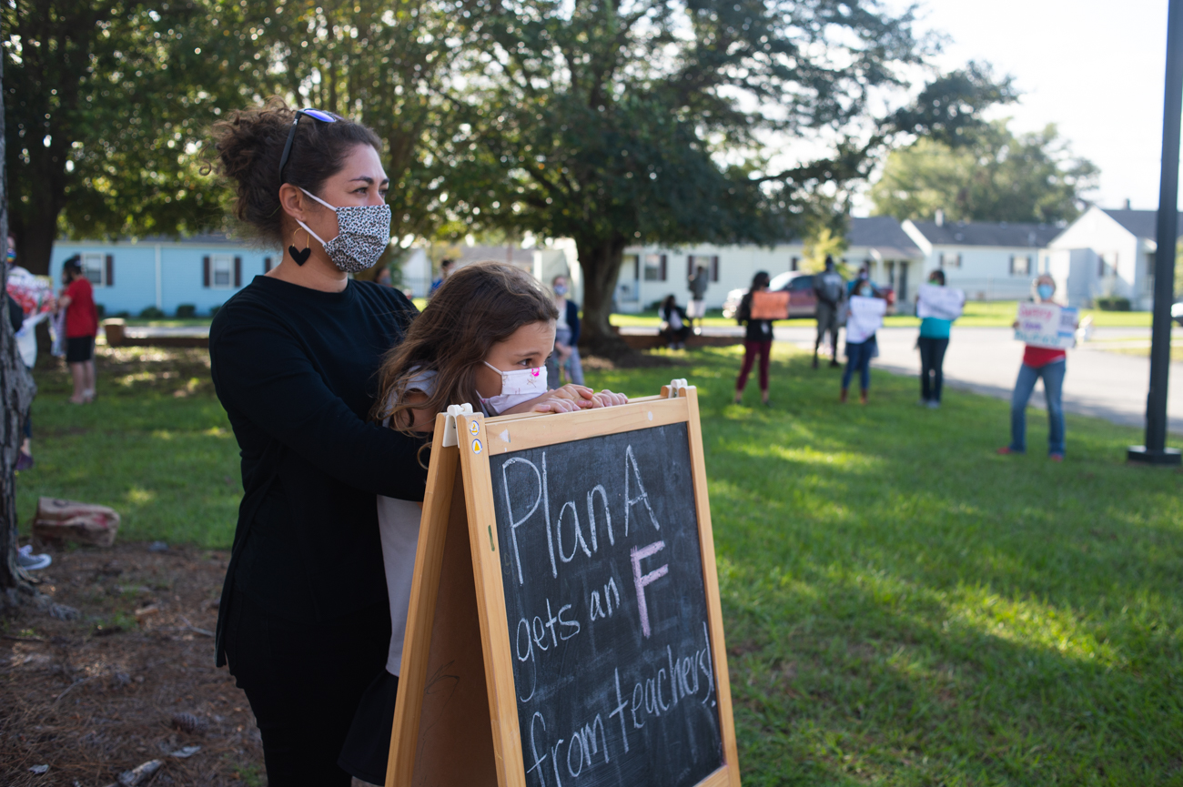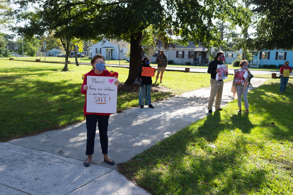 Mary Whitehead, standing with a North Carolina Association of Educators poster, said she has a child who is a senior at a New Hanover school. Although her son is excited to return to the classroom in the Plan B hybrid model, she has told him Plan B isn’t what he thinks it will be.