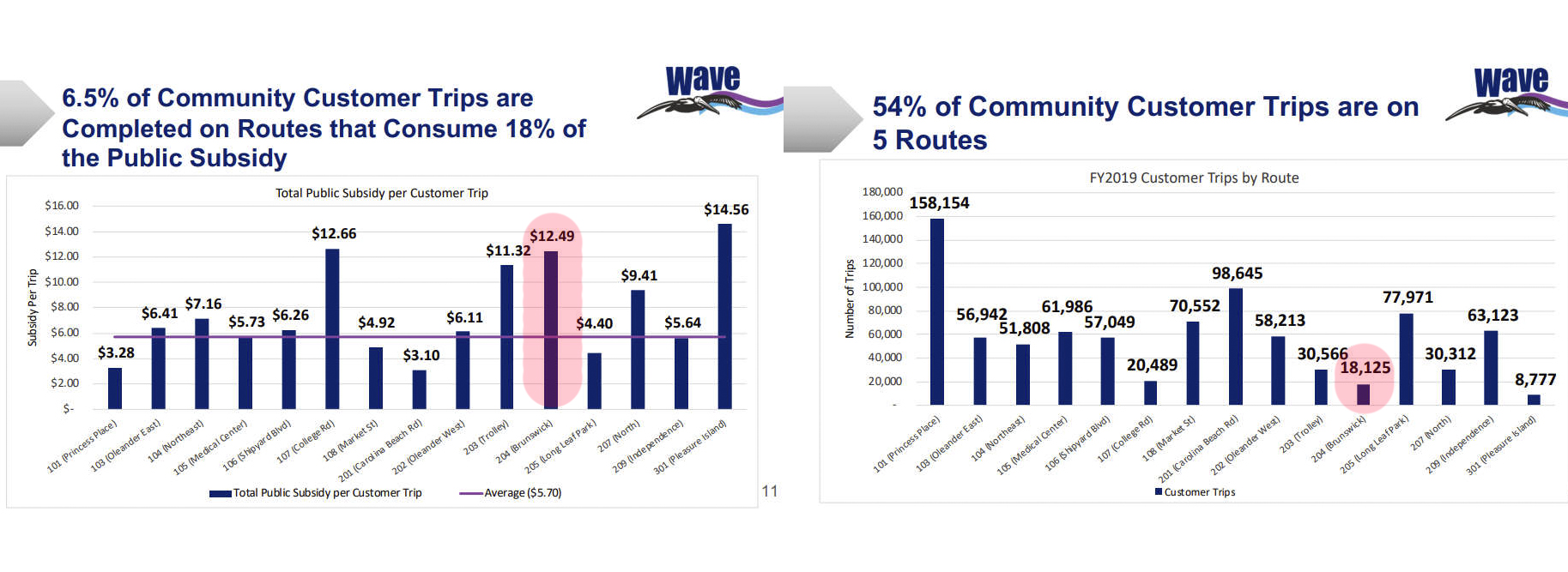 Route 204 was Wave Transit’s second least-traveled route and its third-highest subsidized route last fiscal year. Costing taxpayers $12.49 per rider, the route would have a 6% cost recovery if the Brunswick County Consortium didn’t pitch in.