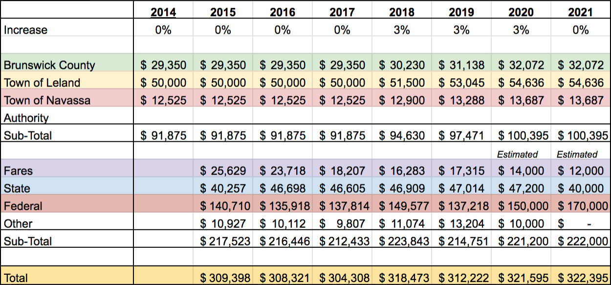 Belville backed out of the group in 2012 after the authority requested more money from the town and the town’s Commissioners were concerned about low ridership. Wave Transit’s funding formula for the Brunswick Connector is roughly based on miles traveled within the given government’s limits. Local governments served by the route (Brunswick County, Navassa, and Leland) pitch in about one-third of the total cost to run the route, with federal funds covering the majority while state and local fares making up the rest.