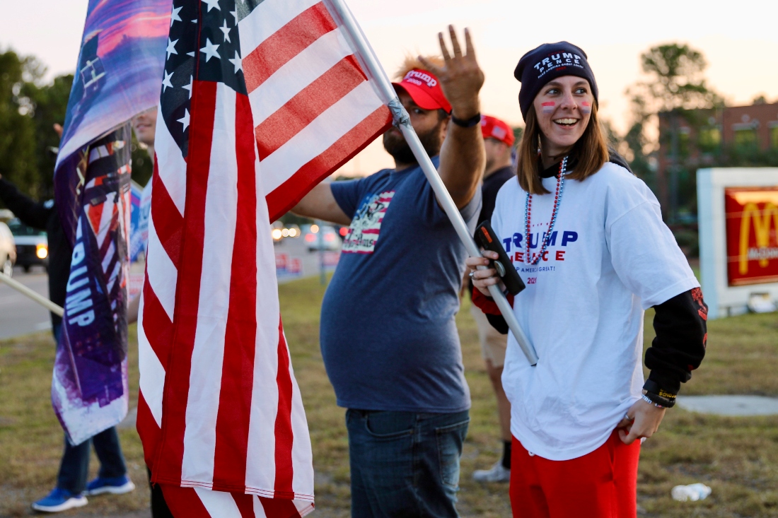 An 8-minute drive away from the UNCW campus, 20-year-old Sable Bird was swinging an American flag along Military Cutoff Road in front of a McDonald’s. Over the sounds of a rock ballad with lyrics about the “Trump Train” and the blare of passing cars’ horns, Bird explained why she’s voting to re-elect the president.