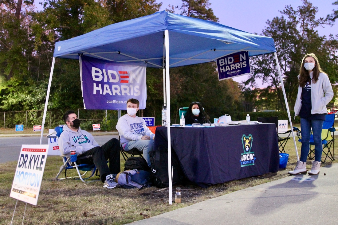 SOUTHEASTERN, N.C. — As the sun set on Election Day, the University of North Carolina at Wilmington College Democrats were still posted at their tent near the Burney Center precinct, in hopes of garnering enough support in the final hours of open polling to turn their purple state blue.