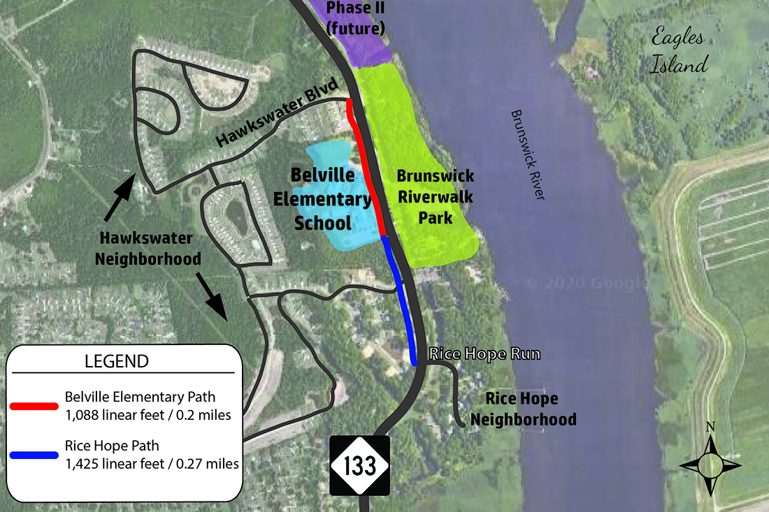 WMPO awarded Belville $350,000 to construct two multi-use paths that connect along Highway 133. One 0.2-mile path will stretch from the Rice Hope neighborhood to Belville Elementary, and the second will connect the school to the Hawkeswater neighborhood.