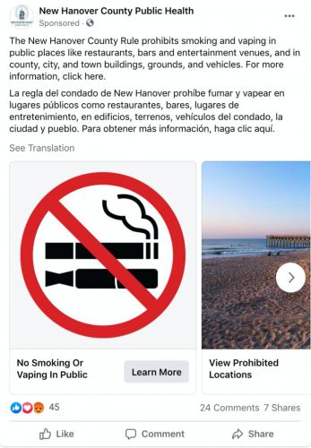 Internet-users who Google vacation rentals, boat rentals or similar services in the county have been targeted with sponsored posts from New Hanover County Public Health, bearing the message that the new rule “prohibits smoking and vaping in public places like restaurants, bars and entertainment venues, and in county, city, and town buildings, grounds, and vehicles.”