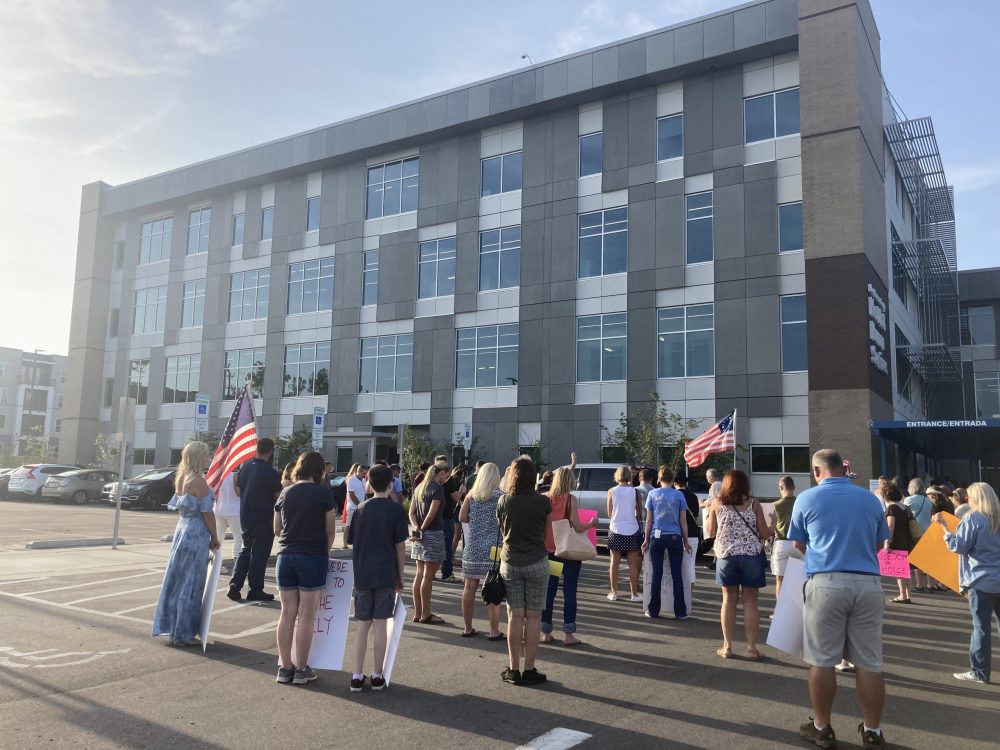 The third speaker, identifying as a doctor in healthcare, addressed the board in support of the mask rule. The crowd soon started to loudly chide her, taunting and interrupting her remarks about how rising Covid-19 case counts have strained the healthcare system.