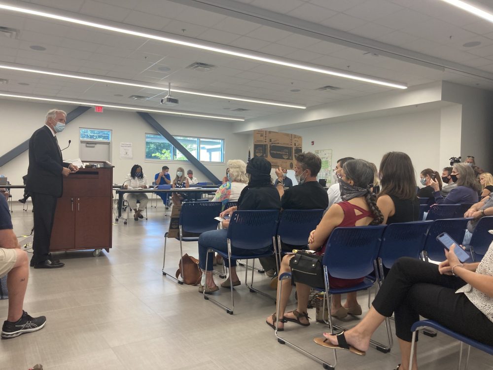 The crowd howled with laughter and started jeering the board members, who were seated in two rows of folding tables facing the audience. County health officials and administrators sat behind the board. Heckles continued through Howard’s answer — which was that masks aren’t required in work-alone office environments or similar private settings. Next came the allotted 45-minute public comment period.