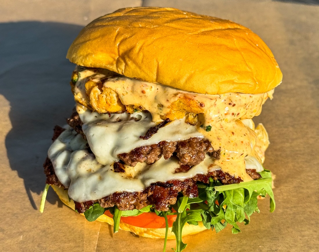 2 freshly ground beef patties, creamy havarti, a house made lump crab cake, remoulade, tomato, and arugula served on a Martin’s potato roll, served with tots.