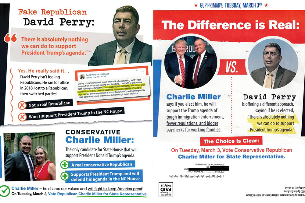 Perry threw the first punch. Miller, the apparent front-runner, has more public service experience with 26 years with the Brunswick County Sheriff’s Office and four terms on the Brunswick County Board of Education. In his first campaign mailer, Miller’s committee delivered material featuring a photo of him with President Donald Trump, with the slogan, “vote to support the Trump agenda.”